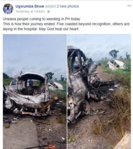 “Unwana people coming to weeding in PH today, This is how their journey ended. Five roasted beyond recognition, others are laying in the hospital. May God heal our heart.”