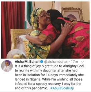 It is a thing of joy & gratitude to Almighty God to reunite with my daughter after she had been in isolation for 14 days immediately she landed in Nigeria. While I’m wishing all those infected for a speedy recovery, I pray for the end of this pandemic. . #AbujaScaleUp