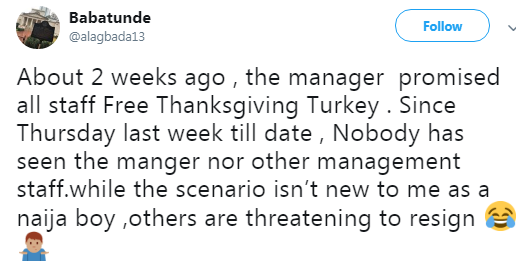 About 2 weeks ago , the manager promised all staff Free Thanksgiving Turkey . Since Thursday last week till date , Nobody has seen the manger nor other management staff.while the scenario isn’t new to me as a naija boy ,others are threatening to resign 😂🤷🏽♂️