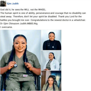 “God did it, he sees the WILL not the WHEEL. The human spirit is one of ability, perseverance, and courage that no disability can steal away. Therefore, don’t let your spirit be disabled. Thank you, Lord, for the battles you brought me over. Congratulations to the newest doctor in a wheelchair. Dr Ejim Chinazom Judith.MBBS.Nig. I overcame.” she wrote.
