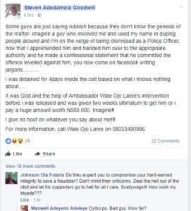 Some guys are just saying rubbish because they don’t know the genesis of the matter, imagine a guy who involved me and used my name in duping people around and I’m on the verge of being dismissed as a Police Officer, now that I apprehended him and handed him over to the appropriate authority and he made a confessional statement that he committed the offence levelled against him, you now come on facebook writing jargons………..