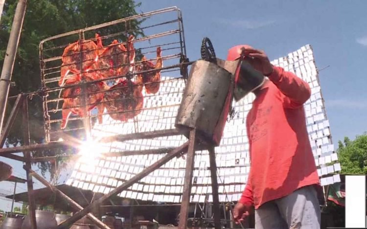 According to odditycentral.com, Sila Sutharat, a roasted chicken street vendor from Phetchaburi, Thailand, has come up with an ingenious way of cooking chicken. Instead of an oven or a charcoal barbecue, he uses 1,000 mobile mirrors that concentrate sunlight into a strong beam. He basically cooks meat with over 300 degrees Celsius of natural sunlight. Meet The Man Who Cook Chicken With Sunlight (Photos+Video)