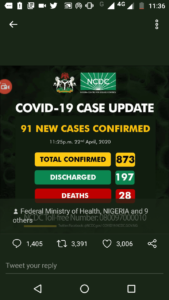 As at 11:25 pm 22nd April there are 873 confirmed cases of #COVID19 reported in Nigeria.