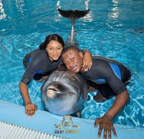The bride in dinner gown and groom in Agbada shaking each other at a doorway