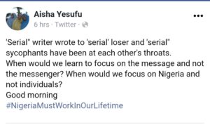 You will recall also that Aisha Yesufu sometimes in 2017 tweeted that: