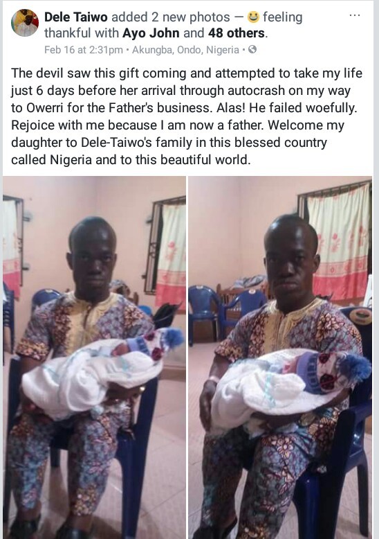 “The devil saw this gift coming and attempted to take my life just 6 days before her arrival through auto crash on my way to Owerri for the Father’s business. Alas! He failed woefully. Rejoice with me because I am now a father. Welcome my daughter to Dele-Taiwo’s family in this blessed country called Nigeria and to this beautiful world.”