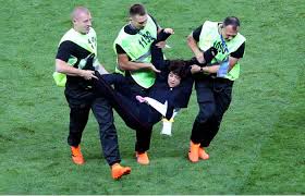 FIFA Officials carrying a Pussy Riot member off the Pitch