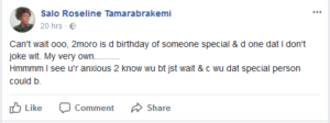 “Can’t wait ooo, 2moro is d birthday of someone special & d one dat I don’t joke wit. My very own..Hmmmm I see u’r anxious 2 know wu bt jst wait & c wu dat special person could b.”