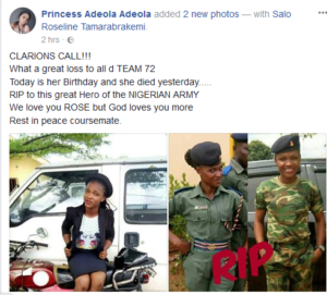 A Nigerian Female soldier, identified as Salo Roseline Tamarabrakemi, has been reportedly dead.