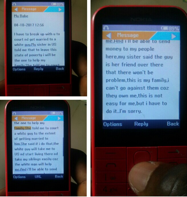 My relationship got broken up on Wednesday. Saturday 30th of sept was her birthday, she was with me and to be honest I made her day, I got her several things and I did all I could to make the day memorable for her, so after she left that night, she started developing strange attitude like not picking my calls, read without replying my messages online, I tried to figure out after 3 days of her strange attitude, below is the text message I sent to her and her reply. … See what poverty has caused.