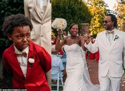 The boy, Bryson Suber was caught on camera by the wedding photographer staring at his mother and crying as she walked to be joined to his father.