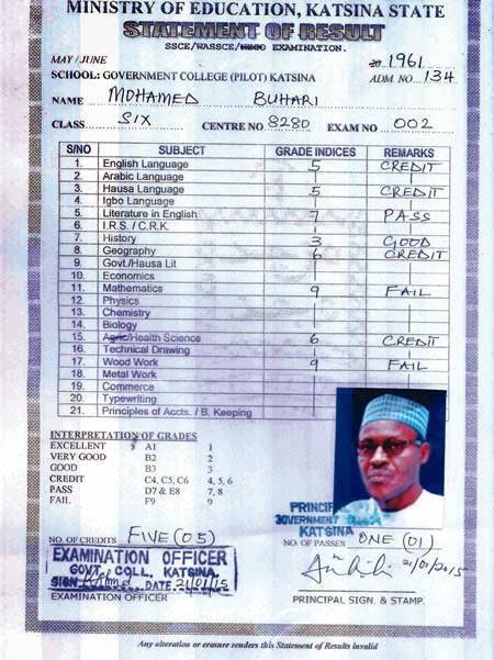 The 2015 Statement of Result carried credits in the following subjects: English Language, Hausa Language, Literature-in-English, History, Geography, Mathematics, Health Science and Wood Work. But Buhari recorded ‘F9’ in Mathematics and Wood Work; could that be the reason the two subjects were missing from the certificate presented to him on Friday, November 2, 2018? The answer, we subsequently found out, is ‘yes’