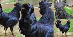 The birds’ black color occurs as a result of excess pigmentation of the tissues, caused by a genetic condition known as fibromatosis and is also characteristic of Chinese Silkies, a black chicken treasured across China.